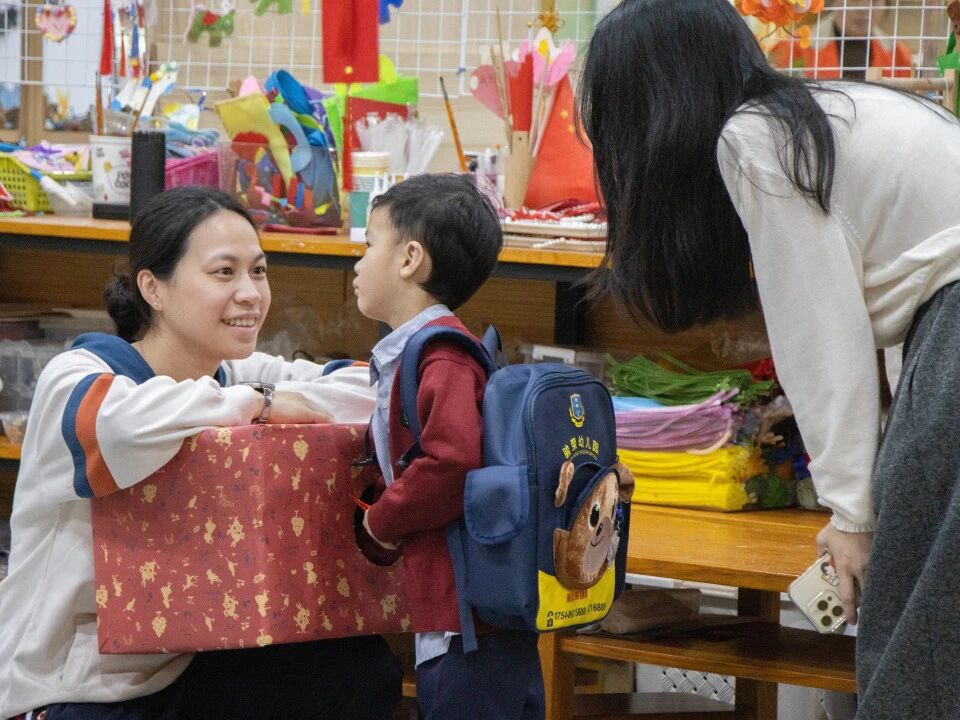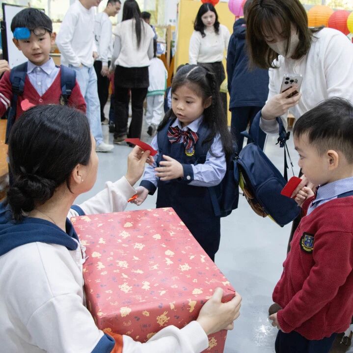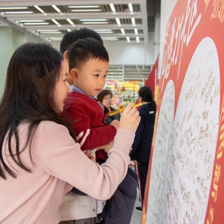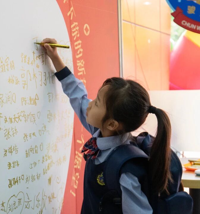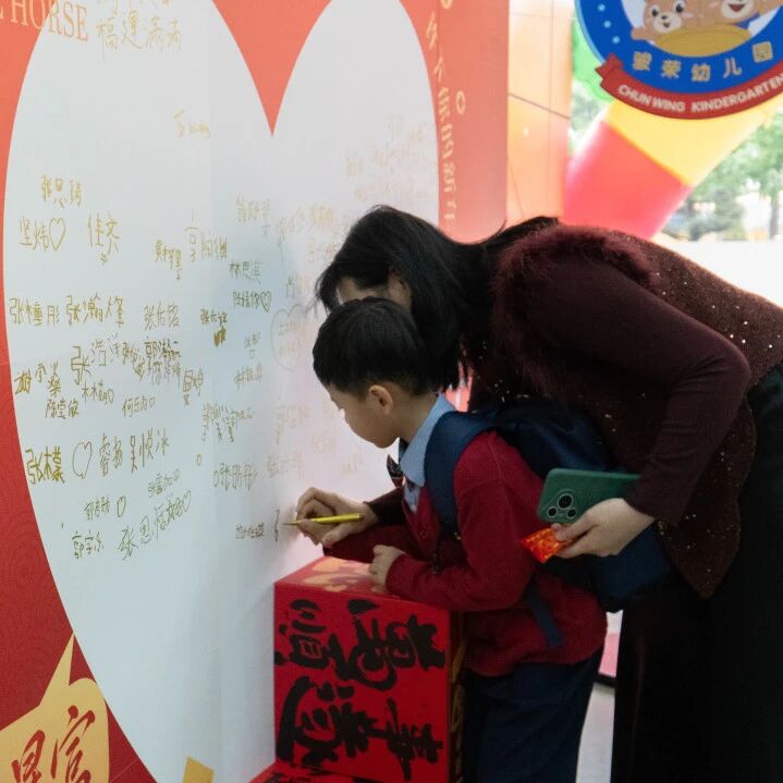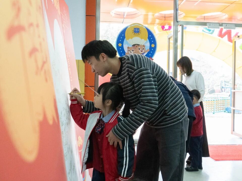 清晨的阳光洒在校园,宝贝们牵着爸爸妈妈的手,在“新年祝福墙”上留下了自己的专属印记。