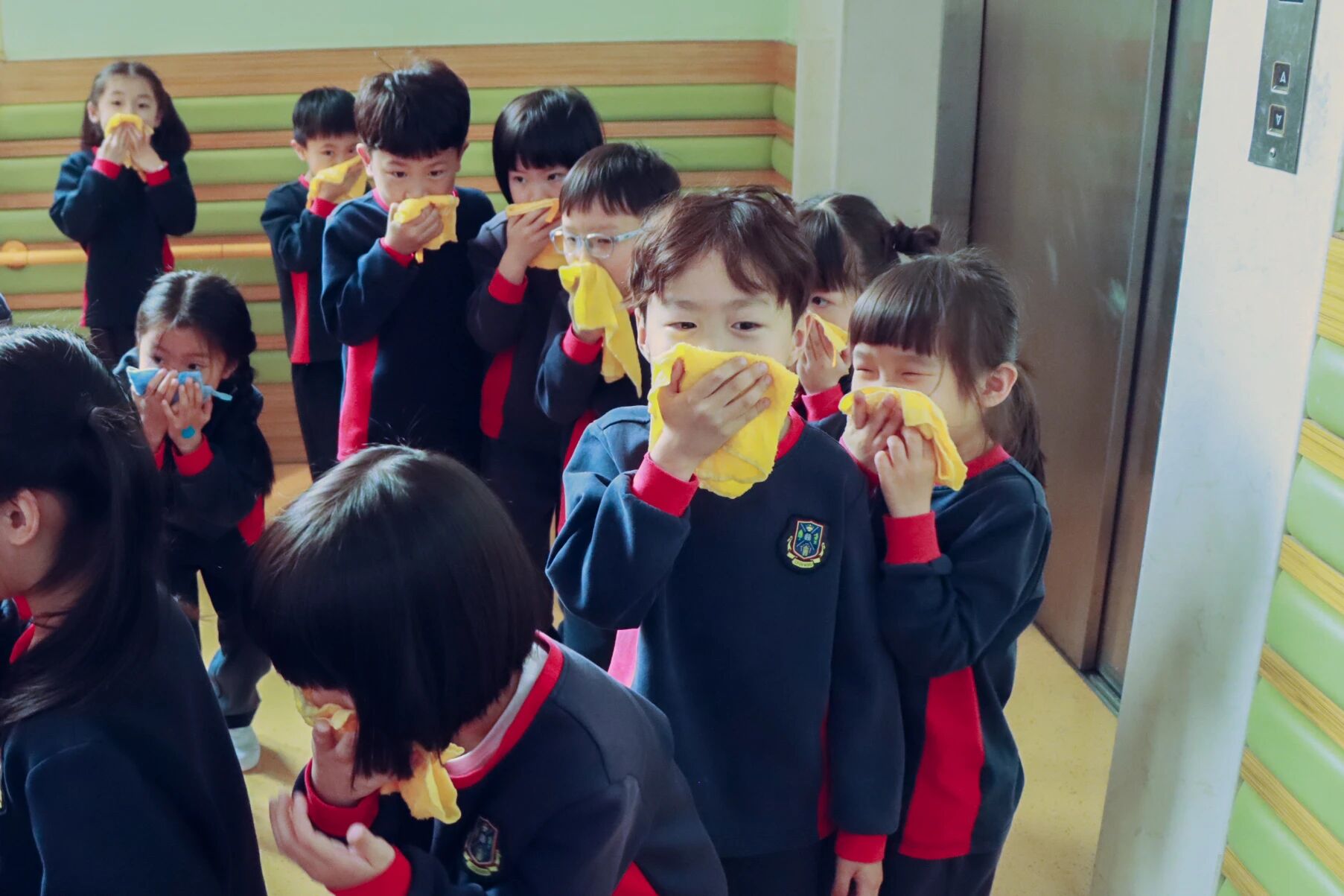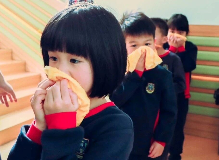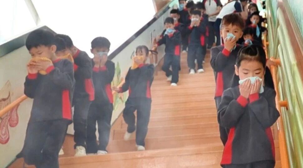 “逃生小能手”们用湿毛巾紧紧捂住口鼻,弯下身子,在老师的带领下有序向安全地带快速转移。